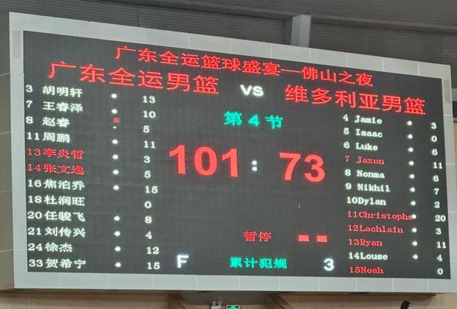 广东全运会阵容来到了佛山,参加“佛山之夜”篮球邀请赛,对手是来自澳大利亚的球队维多利亚男篮,这支球队并不是职业球队,整体实力比较一般。比赛的悬念并不大,广东队一直掌控着比赛局面,并一度在上半场取得了39分的巨大领先。下半场比赛,虽然广东队有所收手,最后一节更是换上了全轮换阵容,不过依旧是以101-73击败对手,取得了一场28分的大胜。