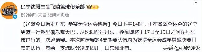 辽宁官方社媒发文说道:今日下午14时,正在备战全运会的辽宁男篮一行乘坐俱乐部大巴,从沈阳前往丹东,参加即将于17日至19日之间在丹东市进行的一次邀请赛。